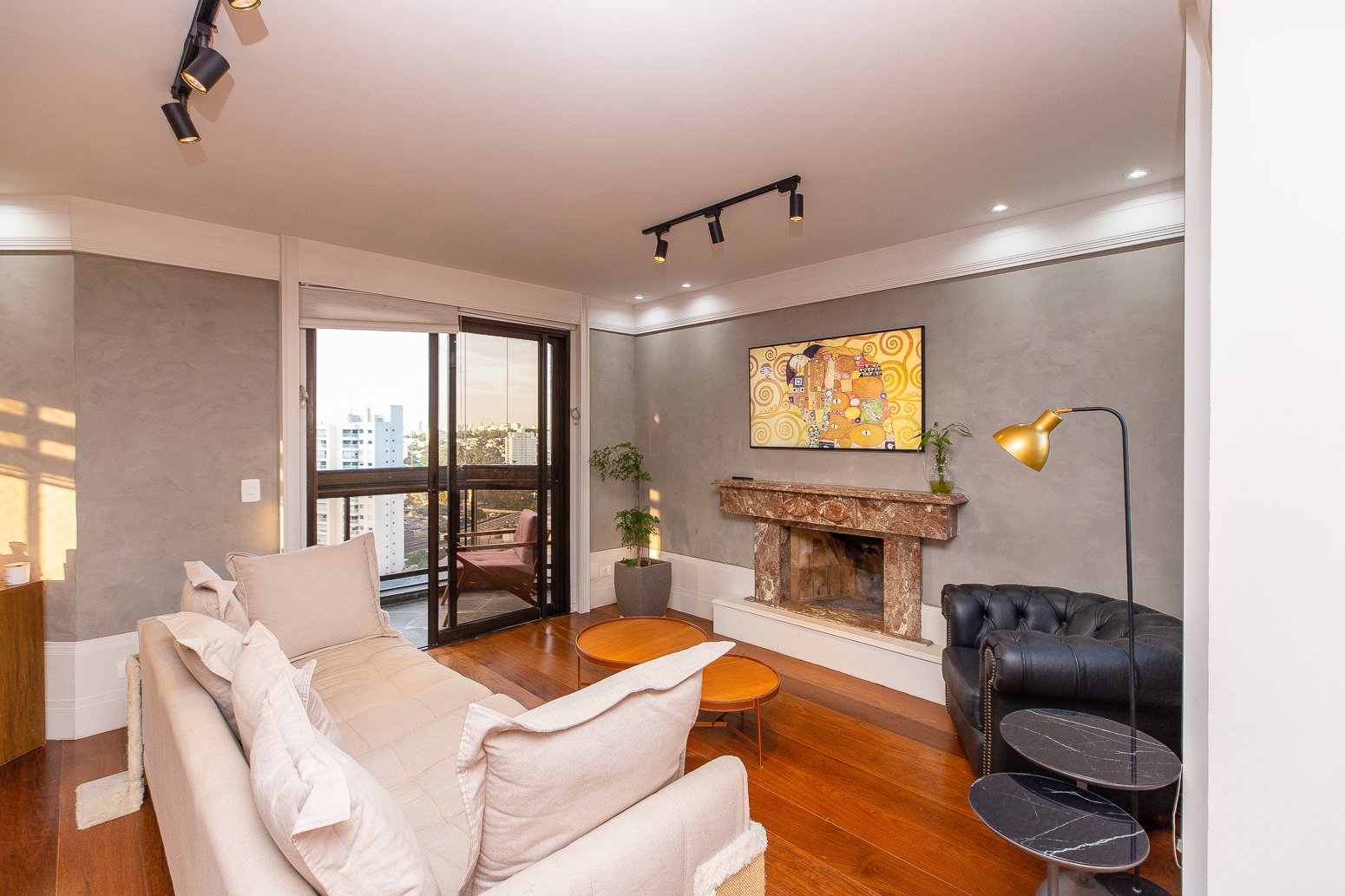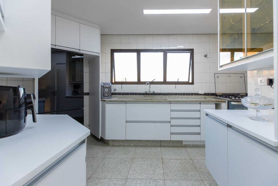 Esta cobertura duplex conta com 327m2 de área útil, muita luz e vista livre. No primeiro andar com hall privativo, temos uma bela e ampla sala com três ambientes: living, estar e jantar, piso de madeira, além de uma varanda já com fechamento de vidro. Encontramos também o lavabo e os 4 dormitórios, sendo 2 suítes. Na suíte principal tem um closet, varanda e banheiro com banheira. A cozinha e a lavanderia também ficam nesse pavimento, assim como o quarto e banheiro de funcionário.