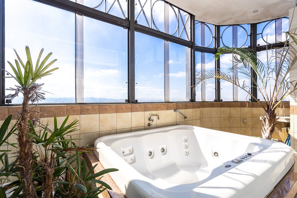 sauna, jacuzzi, churrasqueira e um quarto de funcionários, proporcionando